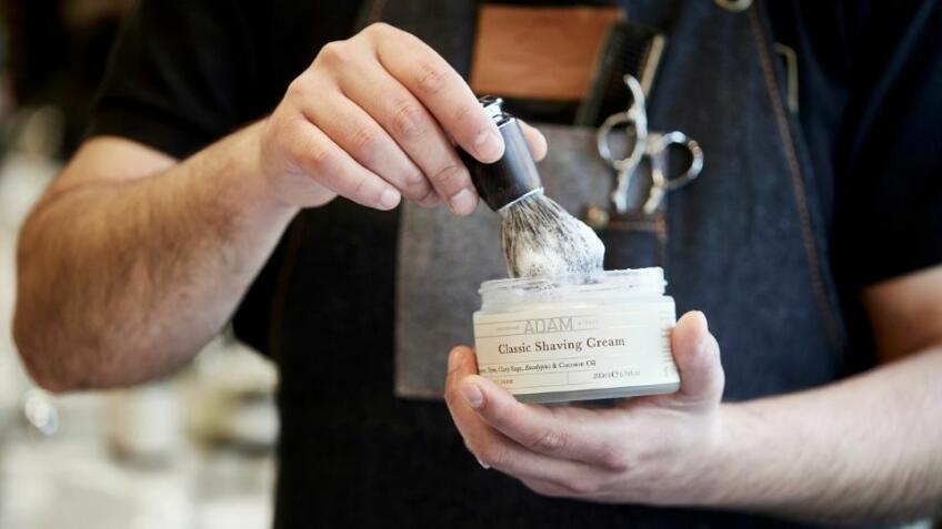 - The next step is to lather your stubble using a shaving brush and ADAM Classic Shaving Cream. Put an olive size amount into a shaving bowl, then dab and swirl your shaving brush in it for a minute or so. Once the soap lathers up and melts down into the brush, start vigorously brushing your face in a circular motion. Use up as much of the cream as possible for a good, even coverage, (but remove lather from any skin tags or moles so you don't cut them). Bonus tip: to tell if the lather is ready, make sure it has a good slippery feel between thumb and index finger. Ensure it feels wet, not greasy and that the lather doesn’t run between your fingers.